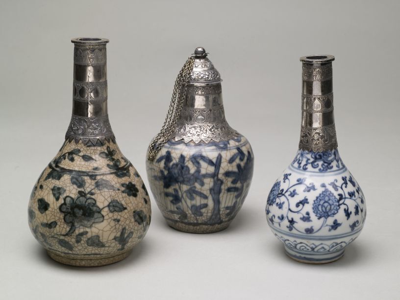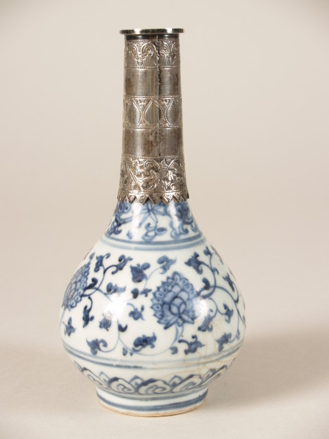 Vaas beschilderd in onderglazuur blauw met rond de voet een band van ruyi-motieven, op de buik lotusranken en op de hals bladranken. Het motief op de hals wordt gedeeltelijk bedekt door het zilveren montuur. Dit montuur heeft drie banden gevuld met bladranken, een druppel- en een abstract motief. Deze vaas had waarschijnlijk ooit een uitlopende mond. Mogelijk is dit gedeelte (deels) afgebroken en is daarvoor in de plaats het zilveren montuur op de vaas gemonteerd, maar het kan ook bewust zijn gedaan om de vaas te verfraaien. (Nederlands)