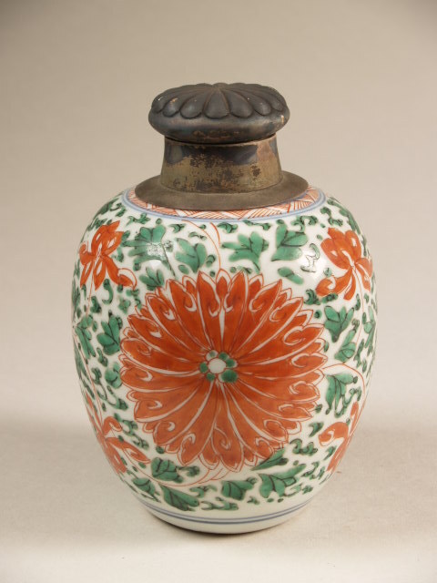 Pot met zilveren deksel met decor van rode bloemen en groene bladeren (Q26466)