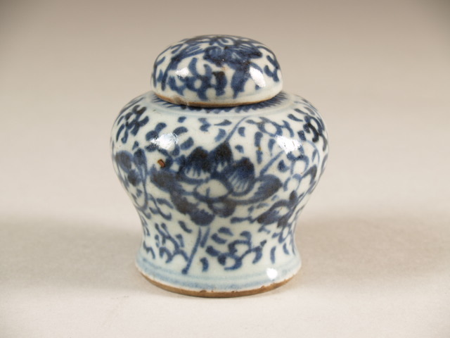 | Nederlands | Potje met deksel en decor van lotus en ranken in onderglazuur blauw |