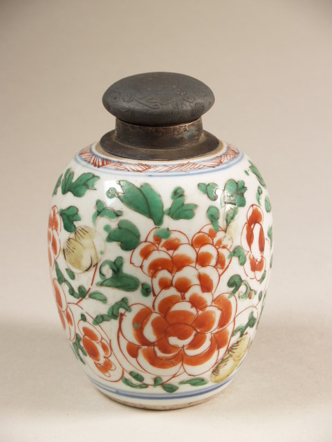 Pot met decor van rode bloemen, groene bladeren en onderglazuurblauwe cirkels (Q26493)