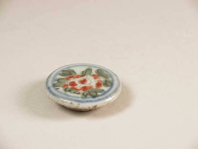 Deksel, plat, met decor van rode bloem en groene bladeren binnen 2 onderglazuurblauwe cirkels (Nederlands)