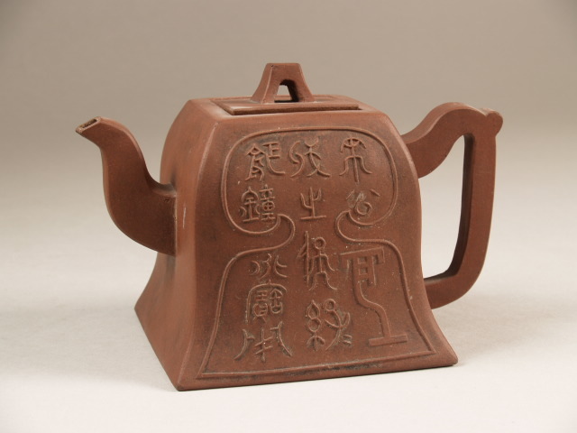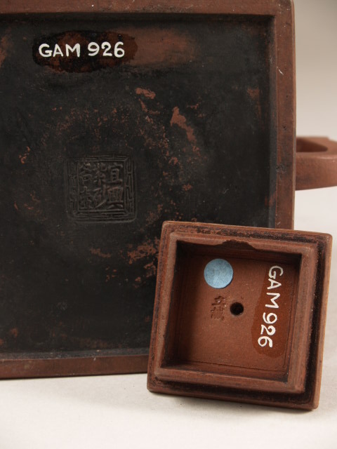 onder op de bodem gestempeld vierkant merk omgeven door meander: "Yi hsing tzû sha......."(bruin steengoed van Yi-hsing.......). Onder op het deksel ingestempeld merk. (Nederlands)