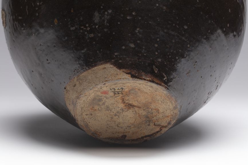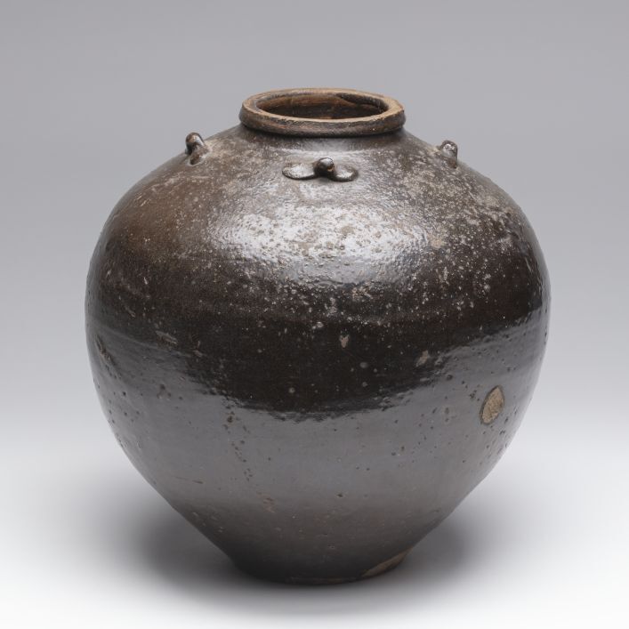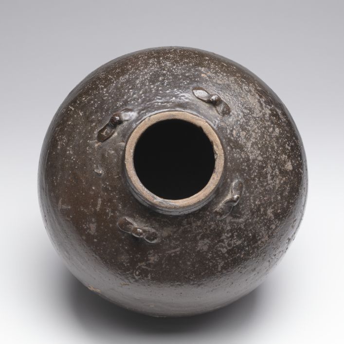 Voorraadpot (wijnpot, martavaan) met een bruin-zwart glazuur, vier oren, een bolle buik en spits toelopend richting de m...ier kleine en horizontaal ingezette oren. Korte verdubbelde liprand.||China||onbekend||Keramiekmuseum Princessehof GAM 0929 |