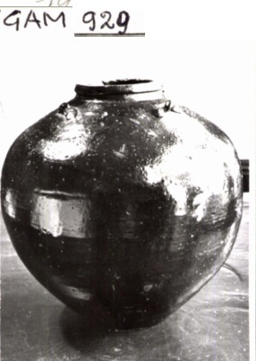 | Nederlands | Voorraadpot, wijnpot, martavaan, binnen- en buiten zijde bruin-zwart geglazuurd, 4 oren, smalle voet - Pot met vlakke onderkant, eivormig lichaam, boven op schouder vier kleine en horizontaal ingezette oren |