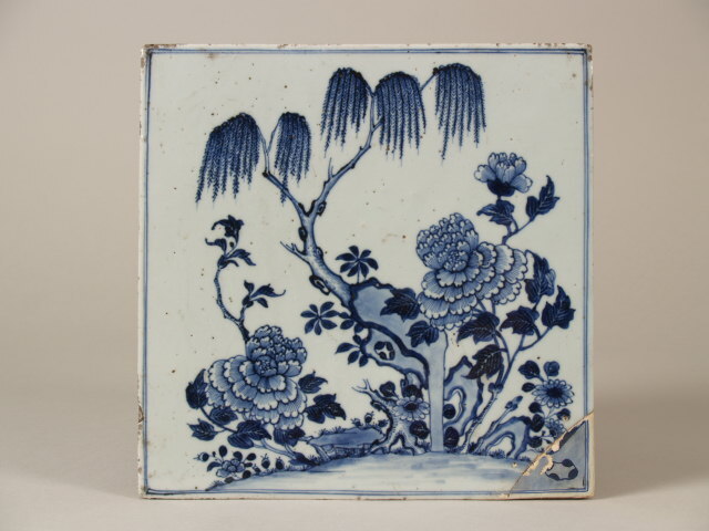 Tegel met decor van treurwilg, bloemranken en rotspartij (Nederlands)