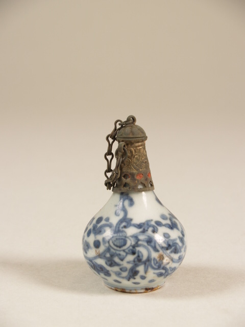 | Nederlands | Miniatuurfles met zilveren montuur en decor van bloemranken in onderglazuur blauw |