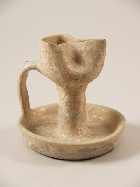 Geelbakkend aardewerk met een wit geïriseerd glazuur. ; Op de cirkelvormige basis met opstaande rand rust de stam die overloopt in het tuitvormig reservoir voor de olie. Aan de achterzijde van het reservoir is een oor aangezet dat rust op de basis. (Nederlands)