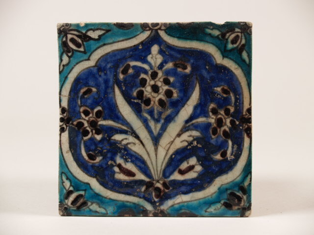 Centraal op de tegel is een bloemmotief bestaande uit drie bloemen en bladwerk aangebracht binnen een accoladevorm. De hoekvulling in de vorm van gestileerd blad. De gebruikte kleuren zijn turqoise, blauw en aubergine.; Aan de achterzijde bevinden zich vier ronde uitsparingen. (Nederlands)