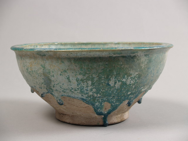 Geelbakkend aardewerk met een turkoois kleurig glazuur.; De kom rust op een ongeglazuurde standring en heeft een kleine ...enzijde sterk geïriseerd. Aan de binnenzijde licht reliefmatige versiering.||Iran||Keramiekmuseum Princessehof OKS 1999-055 |