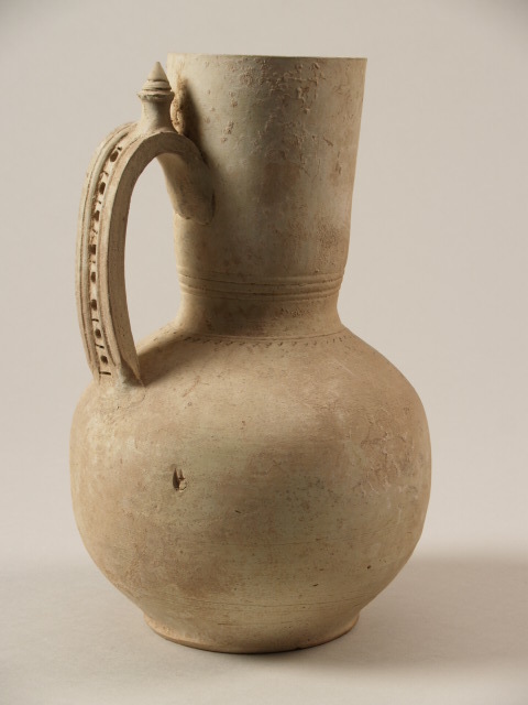 De ongeglazuurde kan met opengewerkt handvat is aan de onderzijde voorzien van een gleufring. De bolle buik verjongt zich in de hoog opgetrokken hals. Op het handvat aan de bovenzijde een kegelvormige nok / bekroning.De versiering bestaat uit eenvoudige, paralel aangebrachte schuine en ingekraste streepjes. (Nederlands)