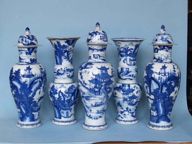 Bekervaas en balustervaas op voetring met bollende spreidende voet. De mond van de bekervazen loopt breed uit, de mond v...zen zijn gedecoeerd met waterlandschappen met figuren, paviljoenen en tempels.||China||Keramiekmuseum Princessehof QLY 0357 |