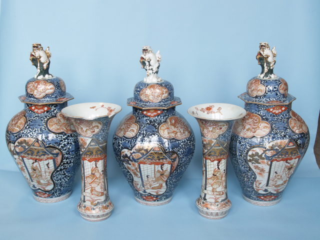 Vijfdelig kaststel, bestaande uit drie achthoekige potten met achthoekigedeksel en twee achthoekige bekervazen. Versierd in onderglazuur blauw, bovenglazuur ijzerrood, zwart en gehoogd in goud. De pot is beschilderd met drie gelobde panelen waarin geisha's zijn afgebeeld in een interieur. De ruimte tussen de panelen is gevuld met een krullen patroon van pioentakken. De schouder is gedecoreerd met drie gelobde panelen met een roofvogel die een haas doodt. Rond de hoge hals drie ruitvormige panelen met perziken. De deksel is versierd met dezelfde panelen met roofvogels als op de pot en bekroond met een boeddhistische leeuw op een boomstam. De bekervazen zijn voorzien van dezelfde decoratie als die op de pot. (Nederlands)