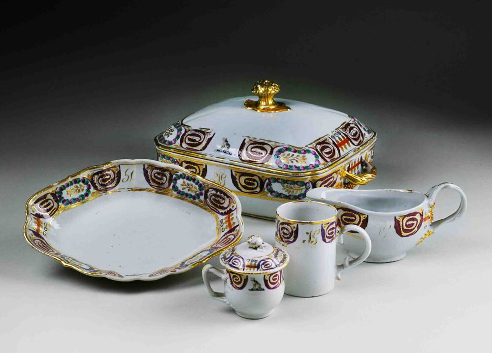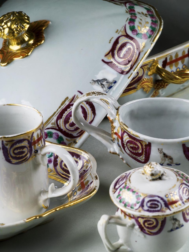 Servies beschilderd over het glazuur in roze, groen, rood, paars, blauw, zwart en goud. Op de rand van het servies krullen waartussen guirlandes met een roos. De rand wordt onderbroken door het initiaal 'TG' en een kat staand op een gestreept vlak en drie bladeren aan ringen onderbroken door een horizontale balk. De gehele rand en enkele andere onderdelen van het servies gehoogd in goud. Famille rose, Het gaat hier zeer waarschijnlijk om het wapen van de Engelse familie Gillespie. Het ontwerp van de decoratie komt uit Worcester (zie CAP v1, p. 790, zie Howard 1974). De borden NO 01721 en NO 05396 hebben hetzelfde decor en zullen waarschijnlijk oorspronkelijk onderdeel van het servies zijn geweest. (Nederlands)