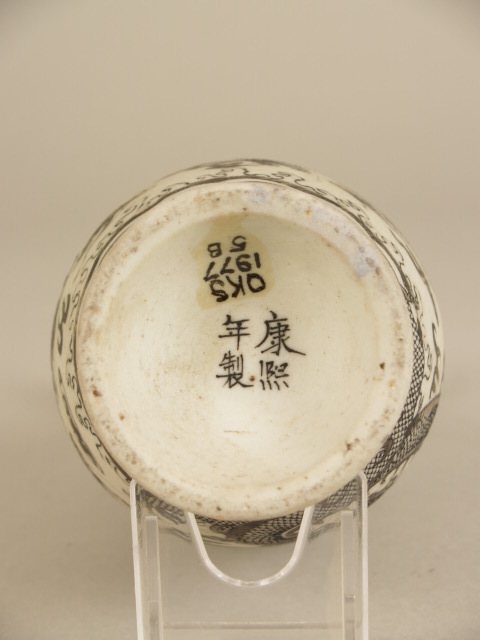 | Nederlands | Vaas, biscuit, met decor van vijftenige draken en wolken in zwart gebrand kobalt |