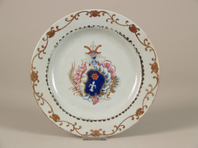 Bord gedecoreerd met het wapen van de familie De Wendt, chine de commande, famille rose (Nederlands)