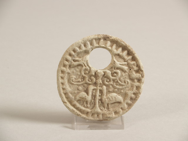 Nagenoeg ronde deksel, 1 van 7 stuks, met een gestempelde decoratie die steeds anders is.; A. leeuw, B. hert, C. twee vogels, D. vogel, E. hert, F. moeflon. ; Als gevolg van de functie hebben de deksels steeds een ronde opening.; (Nederlands)