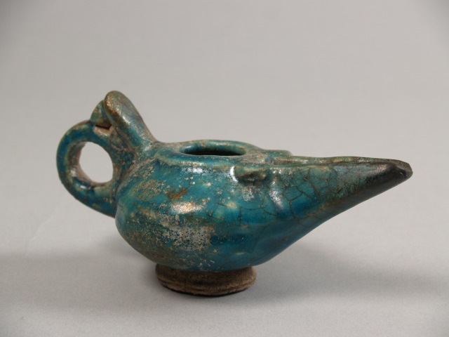 Een van drie olielampjes, waarvan B en C vergelijkbaar zijn qua vorm : hoge stam waarop het reservoir voor de olie, met ingedrukte tuit.; A. Vorm van een snavelkan en rond oor ; A/B/C voorzien van een turquoise glazuur, geïriseerd (Nederlands)