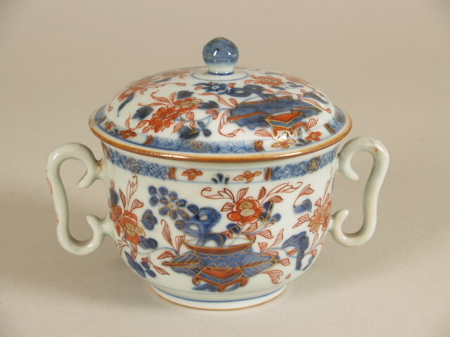 Botervloot met deksel met decor van bloeiende ranken, hekwerk en rotspartijen, imari (Nederlands)