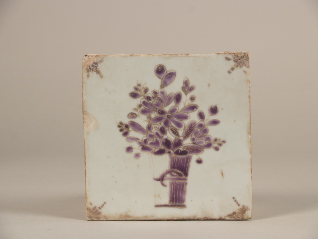 Tegel met decor van bloemenvaas, mangaan (Nederlands)