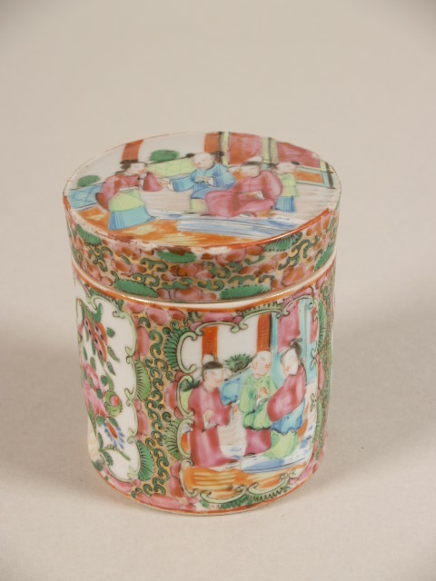 Doos met deksel, onderdeel van 5 in elkaar passende dozen, met decor van figuren en bloemwerk (Nederlands)