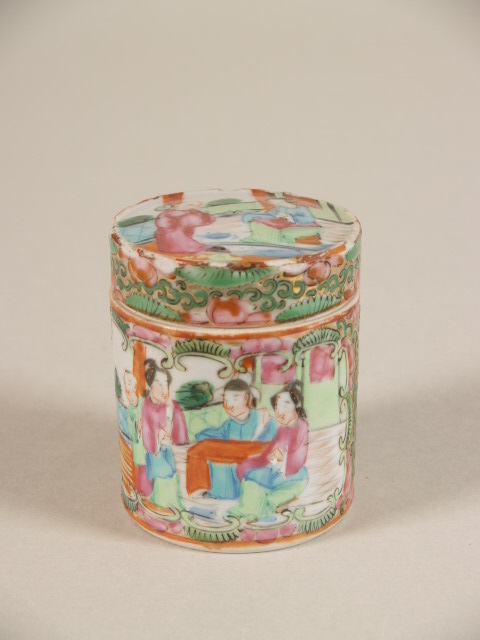 Doos met deksel, onderdeel van 5 in elkaar passende dozen, met decor van figuren en bloemwerk (Nederlands)