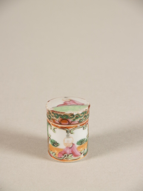 Doos met deksel, onderdeel van 5 in elkaar passende dozen, met decor van figuren en bloemwerk (Nederlands)