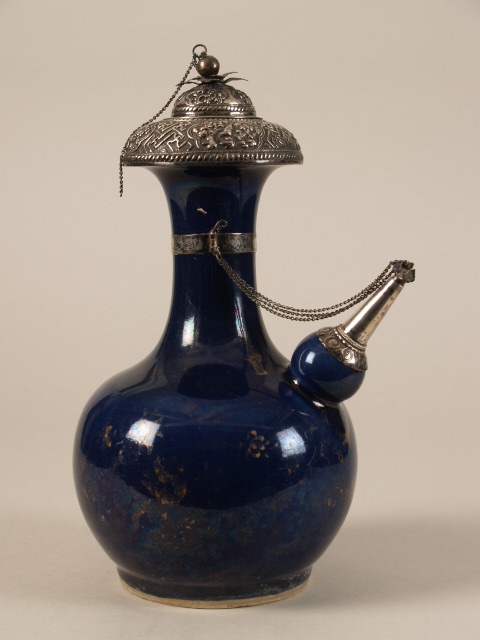 | Nederlands | Kendi met monochroom blauw glazuur en gehoogd met goud, voorzien van een zilveren Javaans montuur |