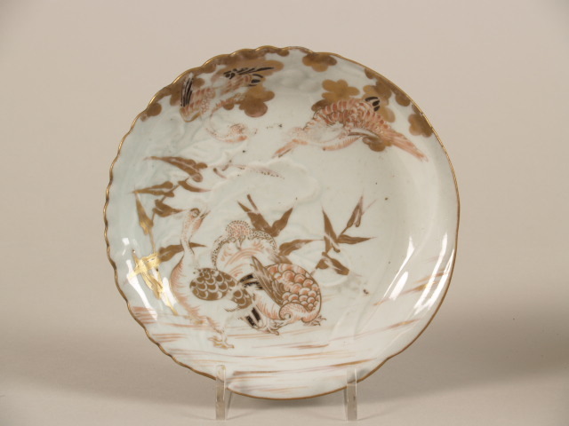 Bord met oneven relobde rand en een in een mal vervaardigde decoratie van bladeren. Daaroverheen beschilderd op het glazuur in rood, zwart en goud. Over het gehele oppervlak een decor decor van een landschap met vogels.. Een aantal vogels staan op gras tussen planten en twee vogels vliegen tussen de wolken. Vergulde rand. Bord onderdeel van een set van twee. (Nederlands)