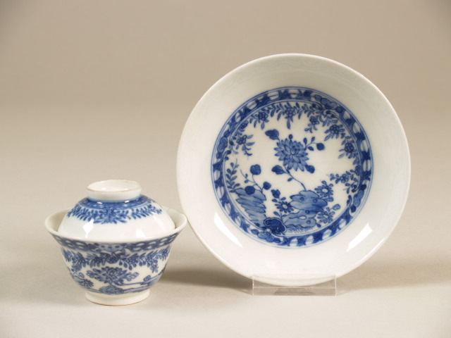 Kop en schotel met deksel en decor van bladeren en bloemen, op de rand een ingegrift decor (Nederlands)