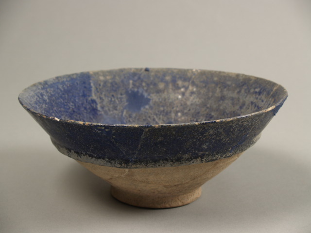 Drie lage kommen, overtrokken met een lapiskleurig alkaliglazuur. De onderzijden en standringen niet geglazuurd.; Ex. A. voorzien van een glanzender glazuur en band van ingegrifte abstracte motieven (Nederlands)