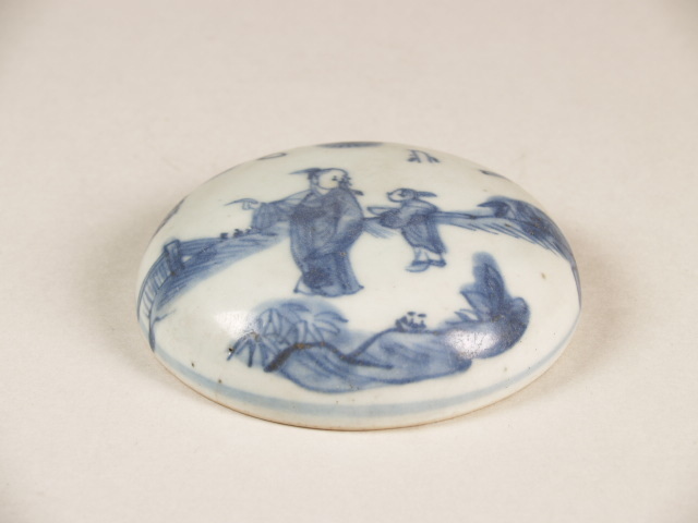 Deksel van doos, rond, met decor van figuren in een landschap (Nederlands)