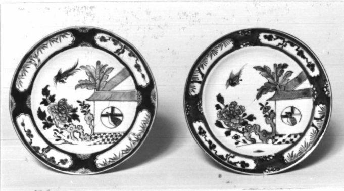 Two dishes with everted and plain brown rim, painted on the interior only in ungerglaze blue. The center has two birds, one persched in a pavillion, the other flying, the rest is garden plants and rocks. Around the rim are four elongated medaillons reserved over blue. two painted with pine spray, two with bamboo sprays. (Nederlands)