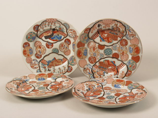 4 borden met decor van samoerai en geisha in imaripallet (Q26967)