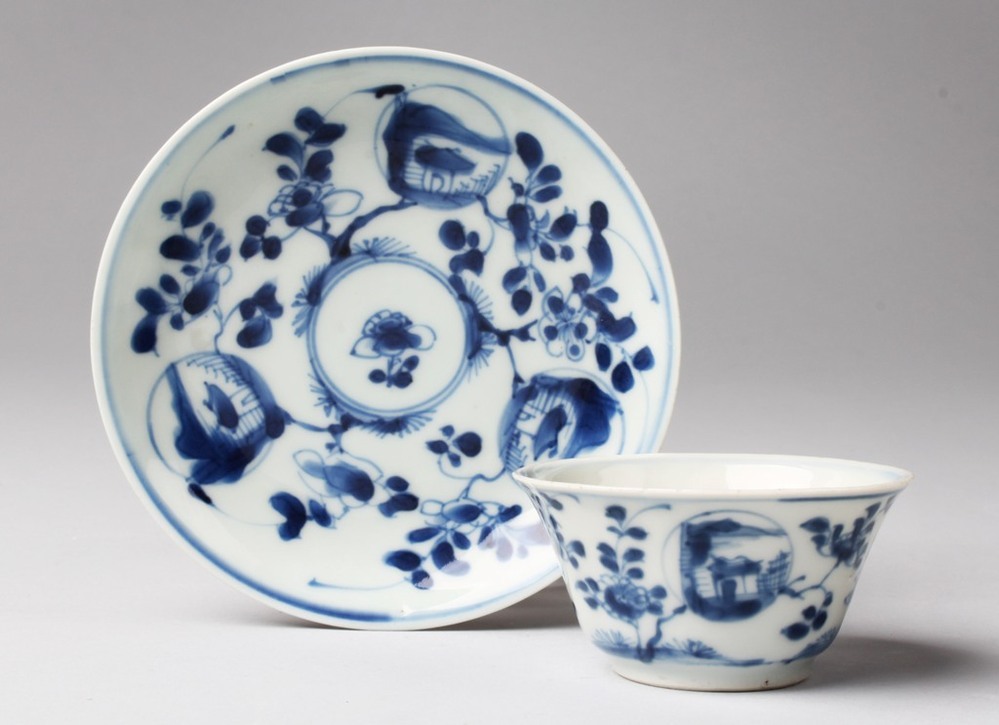 A set of three teacups and and saucers all painted in blue with flora sprays and circulair medaillon enclosing landscape elements.||China||Keramiekmuseum Princessehof QGMP 1986-243 |