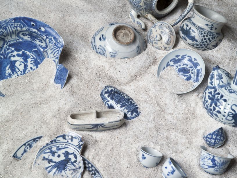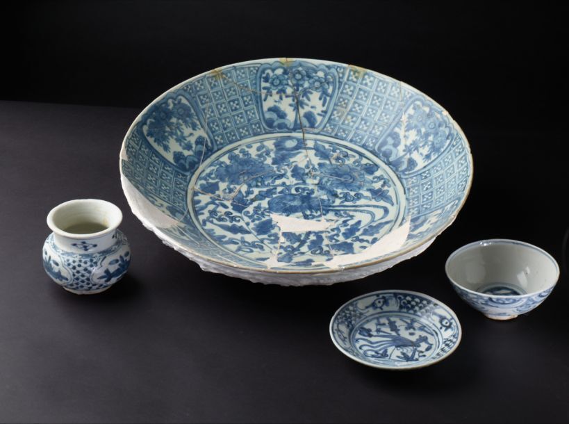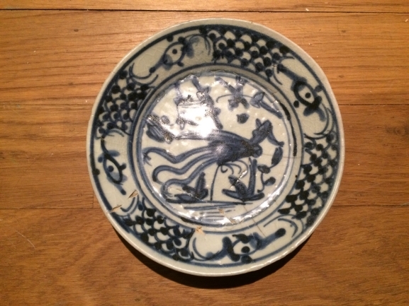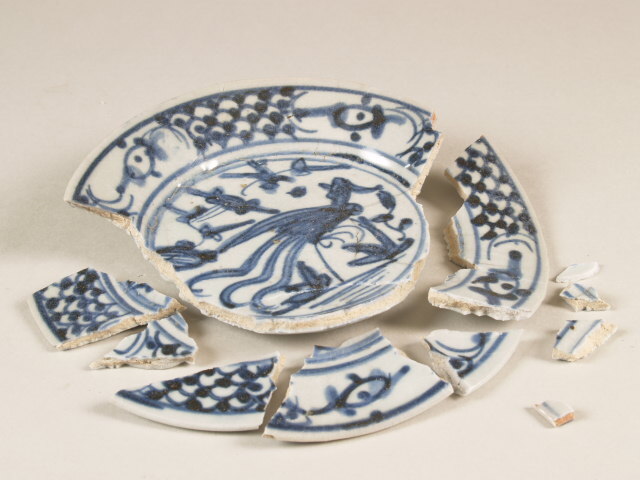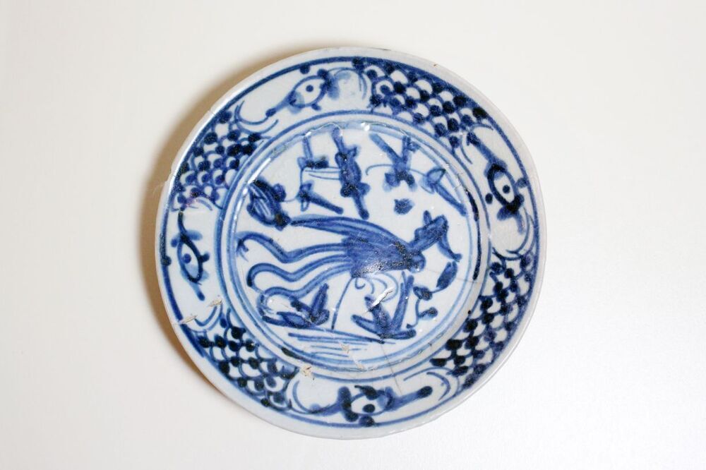 Bord, gerestaureerd uit scherven bord met decor in onderglazuurblauw van feniks||China||onbekend||Keramiekmuseum Princessehof OKS 1977-103 |