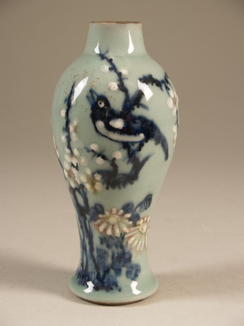 Vaas bedekt met celadon glazuur en beschilderd in onderglazuur blauw en over het glazuur met koperrood en bruin. Op vaas is een decoratie aangebracht van een vogel (ekster) zittend op een prunustak, chrysanten en een rots. celadon (Nederlands)