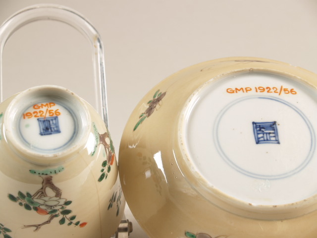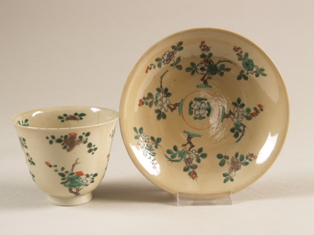 Kop en schotel met decor van bloeiende planten, famille verte op zeemleer, 1 van 6 (Nederlands)