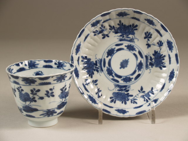 Kop en schotel met golvende rand en decor van bloem- en bladmotieven, 1 van 12 (Nederlands)