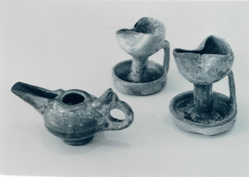 Drie olielampjes waarvan B en C vergelijkbaar zijn qua vorm; hoge stam waarop het reservoir voor de olie met ingedrukte tuit. A: Vorm van een snavelkan en rond oor. A/b/C: Voorzien van een turquoise glazuur, geïriseerd. (Nederlands)