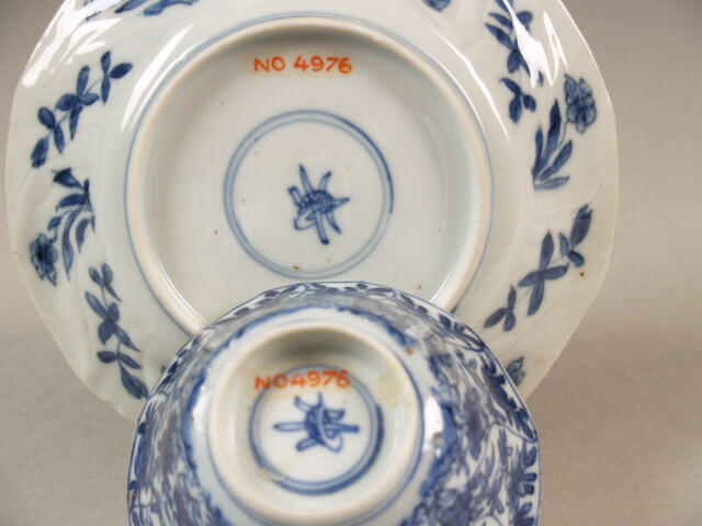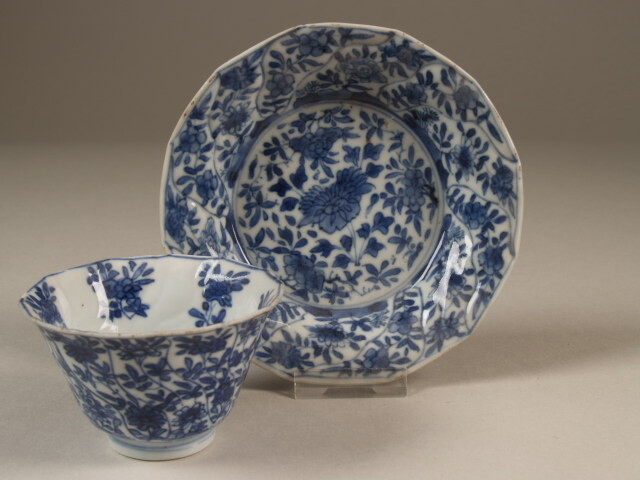 Kop en schotel, hoekig en gedraaid en met decor van peterseliemotief, 1 van 13 koppen en 4 schotels (Nederlands)