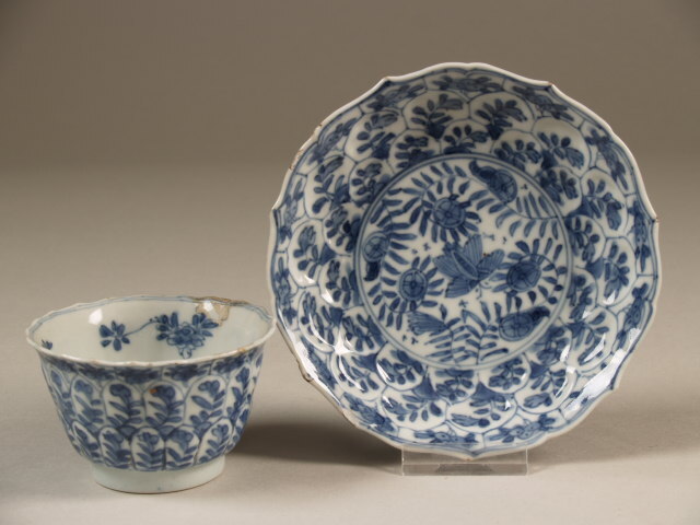 | Nederlands | Kop en schotel, golvend en geschulpt en met decor van bloemmotief, 1 van 3 |