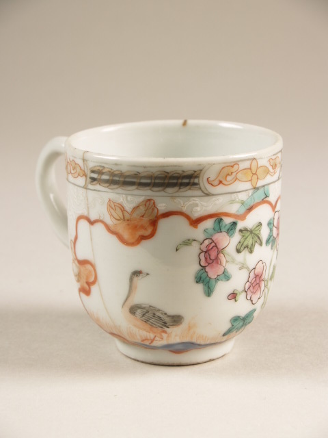 Kop met oor en decor van rozet waarin bloemen en vogel bij een rots, famille rose (Nederlands)