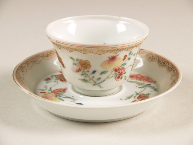 Kop en schotel met decor van bloemen en lingzi, famille rose (Nederlands)