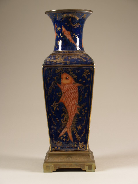 Vaas met koperen ring en voetstuk, vaas vierkant met ronde hans, met decor van karpers (Nederlands)