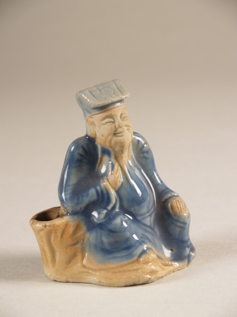 Waterdruppelaar in de vorm van een zittende man met blauwe mantel (Nederlands)