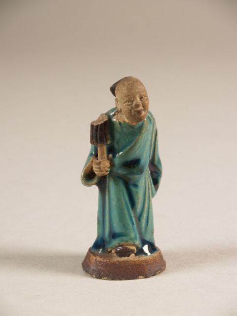 Beeld in de vorm een man, staand, gekleed in wijde mantel en met parasol in de rechterhand (Nederlands)