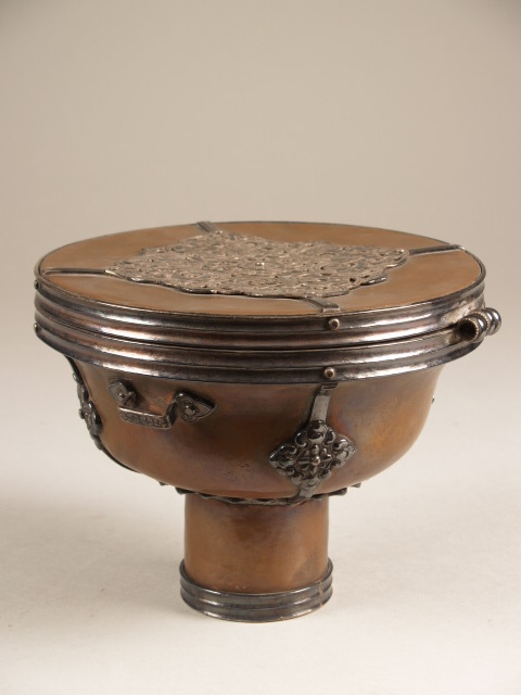 Wit geglazuurde stemcup. Het wit neigt naar het blauw-grijs en vertoont vele oneffenheden. De onderrand aan de voet is ongeglazuurd en binnen in hol aan buiten- en binnenzijde. De koperen foudraal is met zilverbeslag versierd. (Ingekorte beschrijving). (Nederlands)