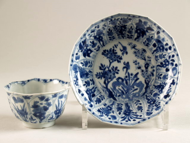 in kobaltblauw. Koppen: een lotusbloem in dubbele ring. Schotels: 25: een schelp in dubbele ring; de andere: een insekt in dubbele ring (Nederlands)