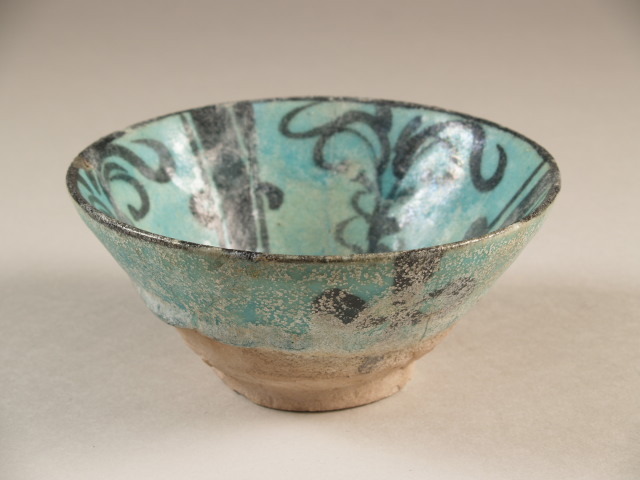 kom met recht uitlopende wand, waarvan binnen en gedeeltelijk ook buitenzijde met een turquoise, transparant glazuur is overdekt. Binnenzijde zwart floraal decor||Iran||onbekend||Keramiekmuseum Princessehof MPH 2007-213 |
