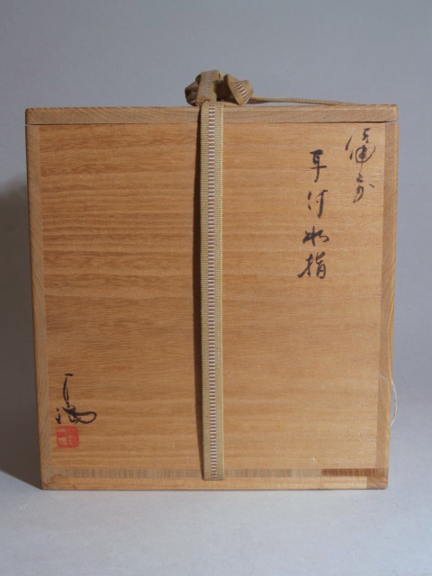 Houten doos met Japanse tekens en lint om mee te sluiten, dient als verpakking voor pot met deksel (Nederlands)